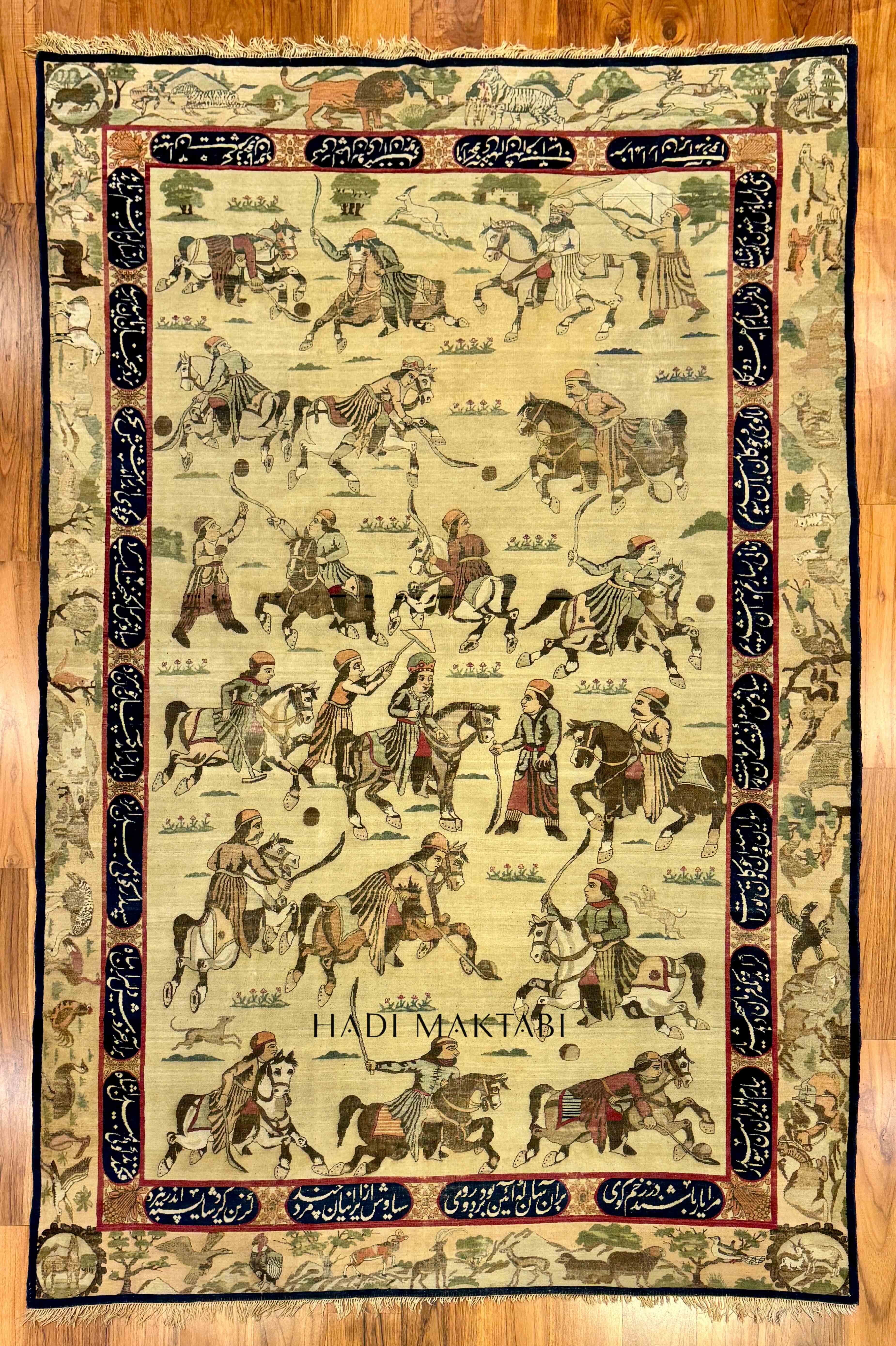 Itβs likely to be the oldest Polo carpet in history, adding to its significance. A lot of action unfolds in the borders: a very long band of calligraphy all around the main field recounts the exploits of Siavash. These are verses directly culled from the Shahnameh, very elegantly inwoven and inscribed in fine π£ππ¨π©ππ‘ππ¦ script.