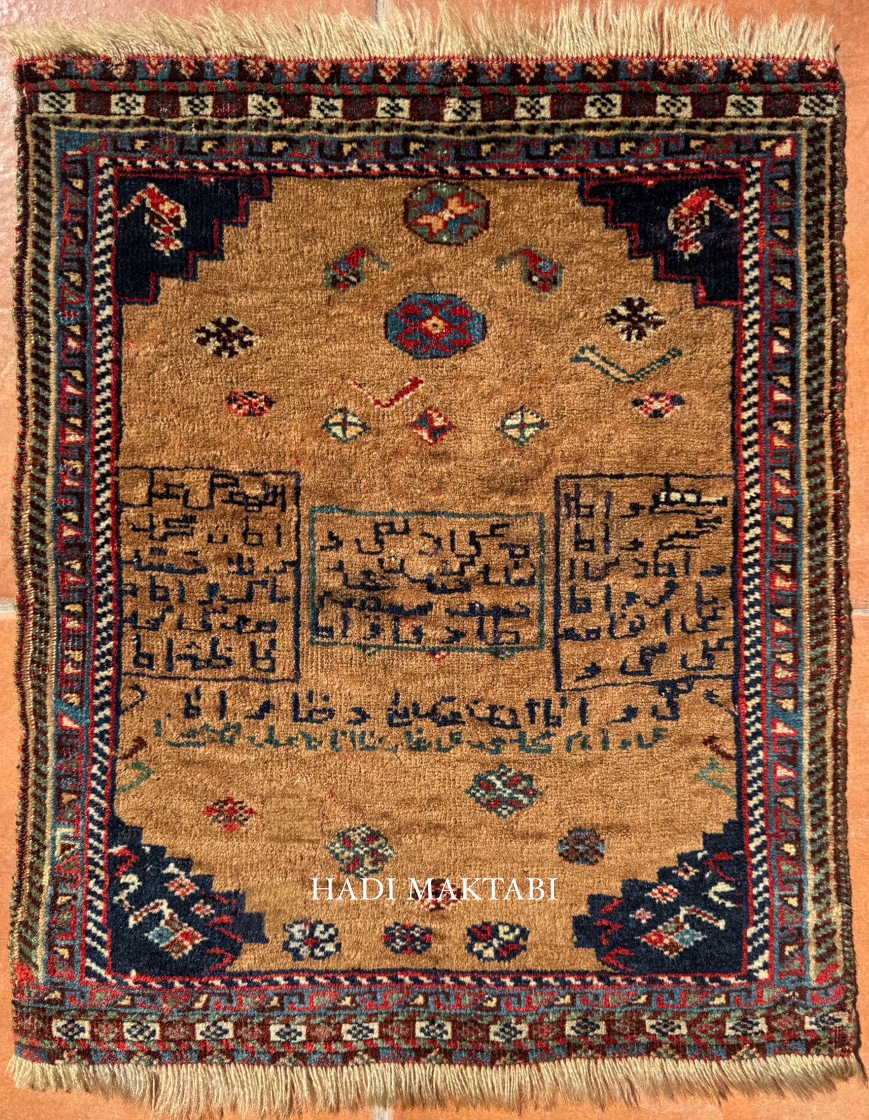 A unique work of ethnographic art, this tiny carpet punches far above its weight. As a general rule, nomads were illiterate and we barely find any writing on tribal rugs beyond the scarce signature here or a date there. Suddenly this appears and it is quite a welcome conundrum.