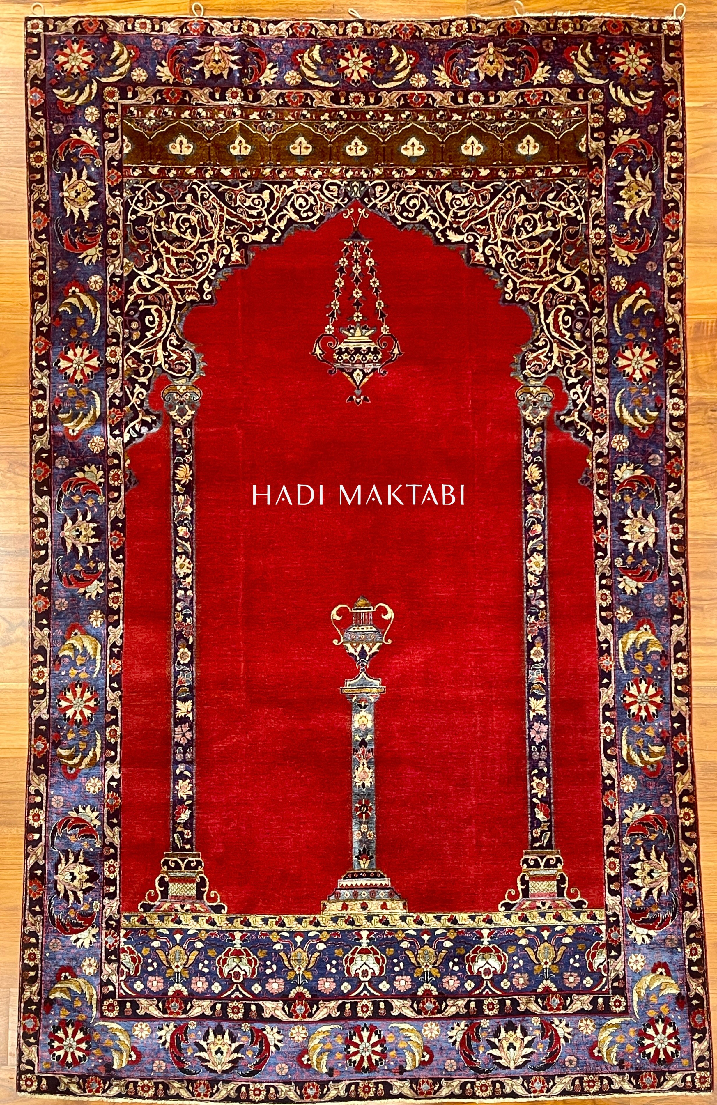 In architectural compassion, the mehrab is supported by twin columns. It rises gracefully and, from its apex, dangles a brilliantly designed oil lamp along 3 chains--all executed in shiny silk. What is most eye catching is the podium rising partially from the center of the base, as if aiming to meet the lantern but not quite reaching.