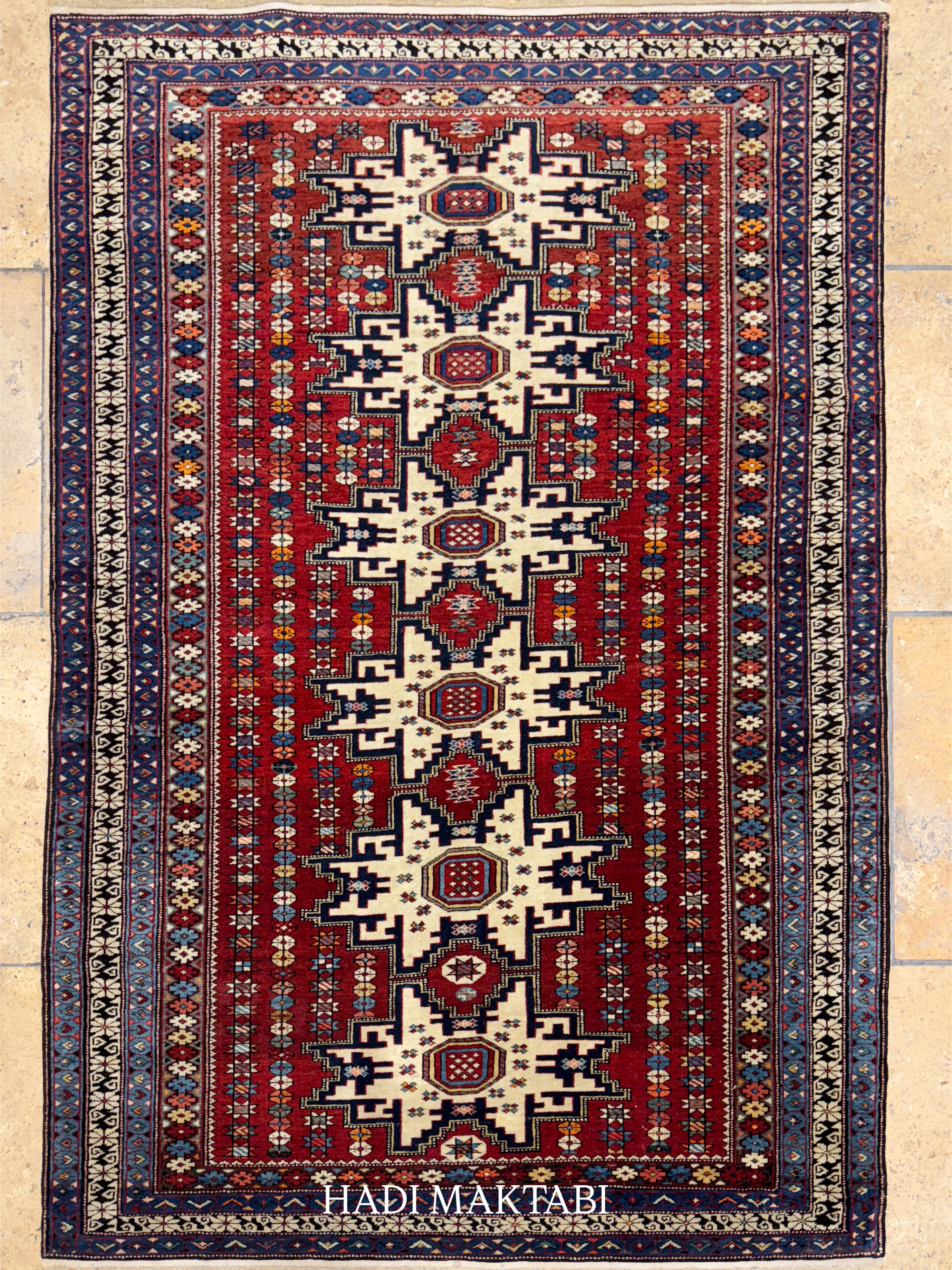 Ultra fine and high grade collectible antique Caucasian rug from the Kuba Khanate. Such fine carpets have escaped the market in the last 20 years after the 1990s craze for Caucasian collecting following the downfall of the USSR. It is a welcome surprise and indeed a pleasure to find and acquire such a stellar example. The star shaped motifs are the heraldic emblem of the Lesghi tribes that inhabit the northeast Caucasus. The dye materials and the secondary motifs are all stellar.