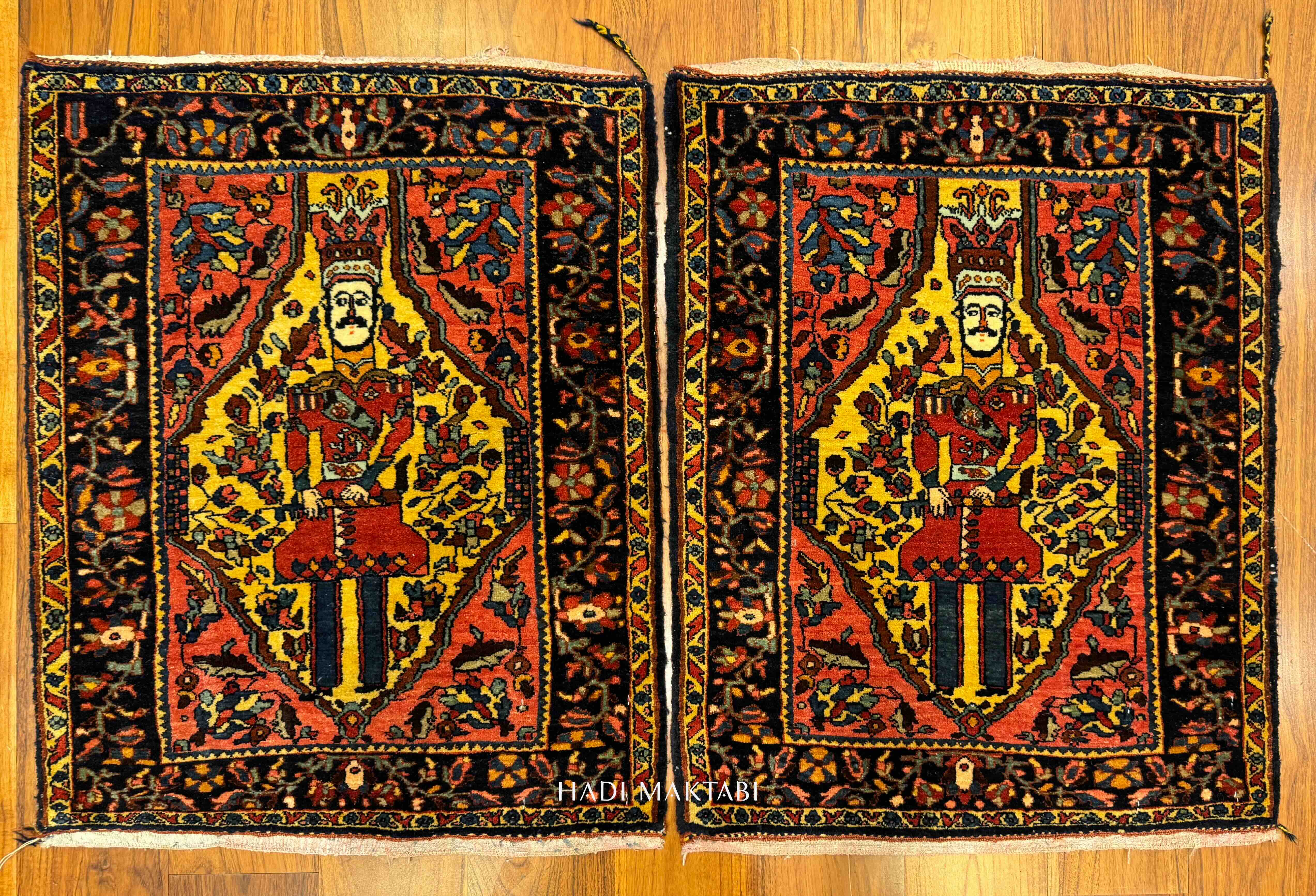 A dizzyingly beautiful and incredibly rare pair of antique Saruk π±π°π΄π©π΅πͺ rugs depicting the mythical founder of Persian kingship, Houshang Shah. He is mentioned in Ferdowsi's πππππ£ππ’ππ epic poem and the rugs here are truly epic in their own right.