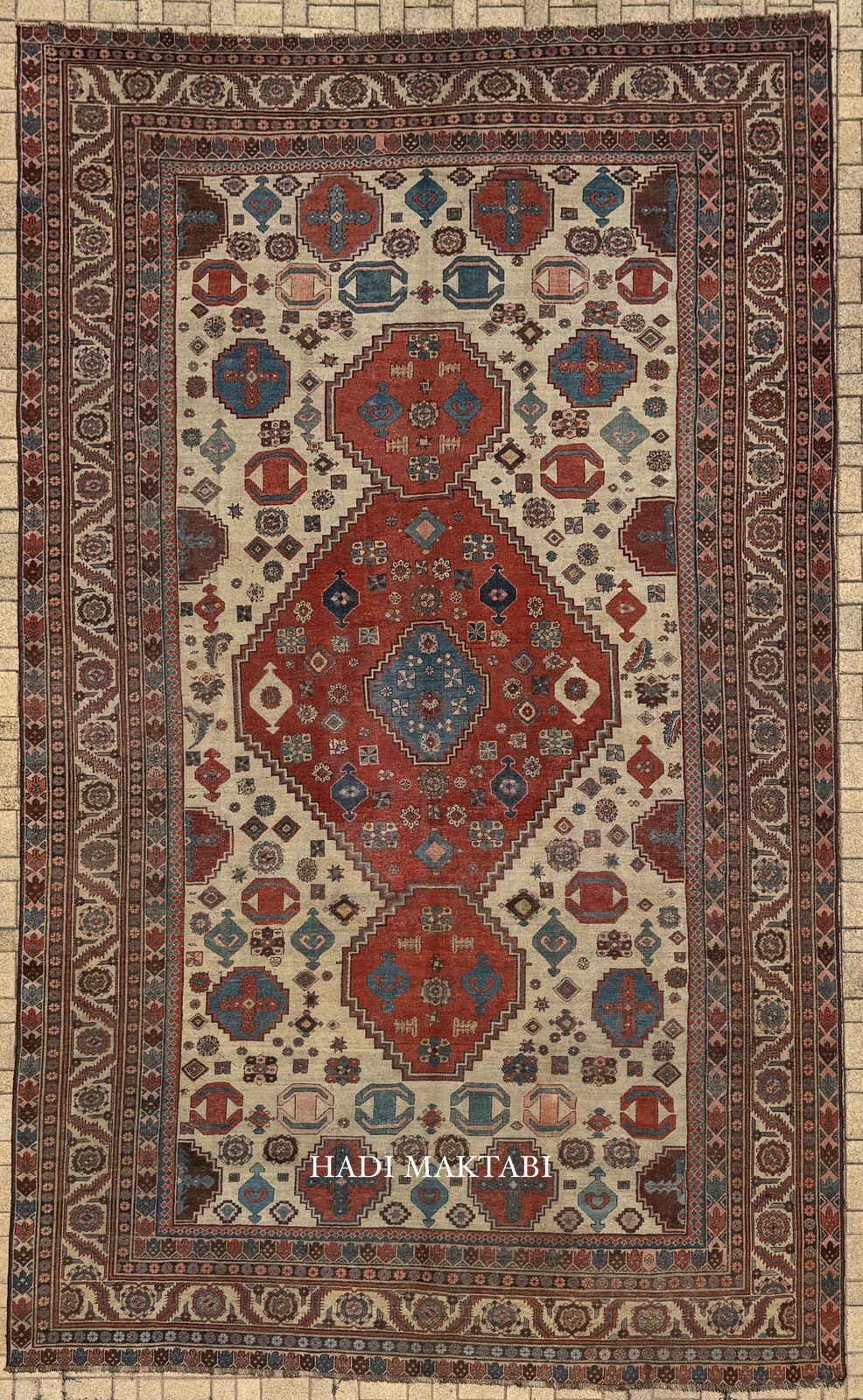 An archaic and very early Bakhshayesh of large size, it is quite easy on the eye with its soft earthy coloration and ivory tones. The woolen foundation and Caucasian style motifs posit the early dating, prior to the permanent closure of the Russo-Persian border in 1881, as well as the odd size (halfway between the ancient Kelleh format of 6 x 2 and the Ziegler-esque 6 x 4).